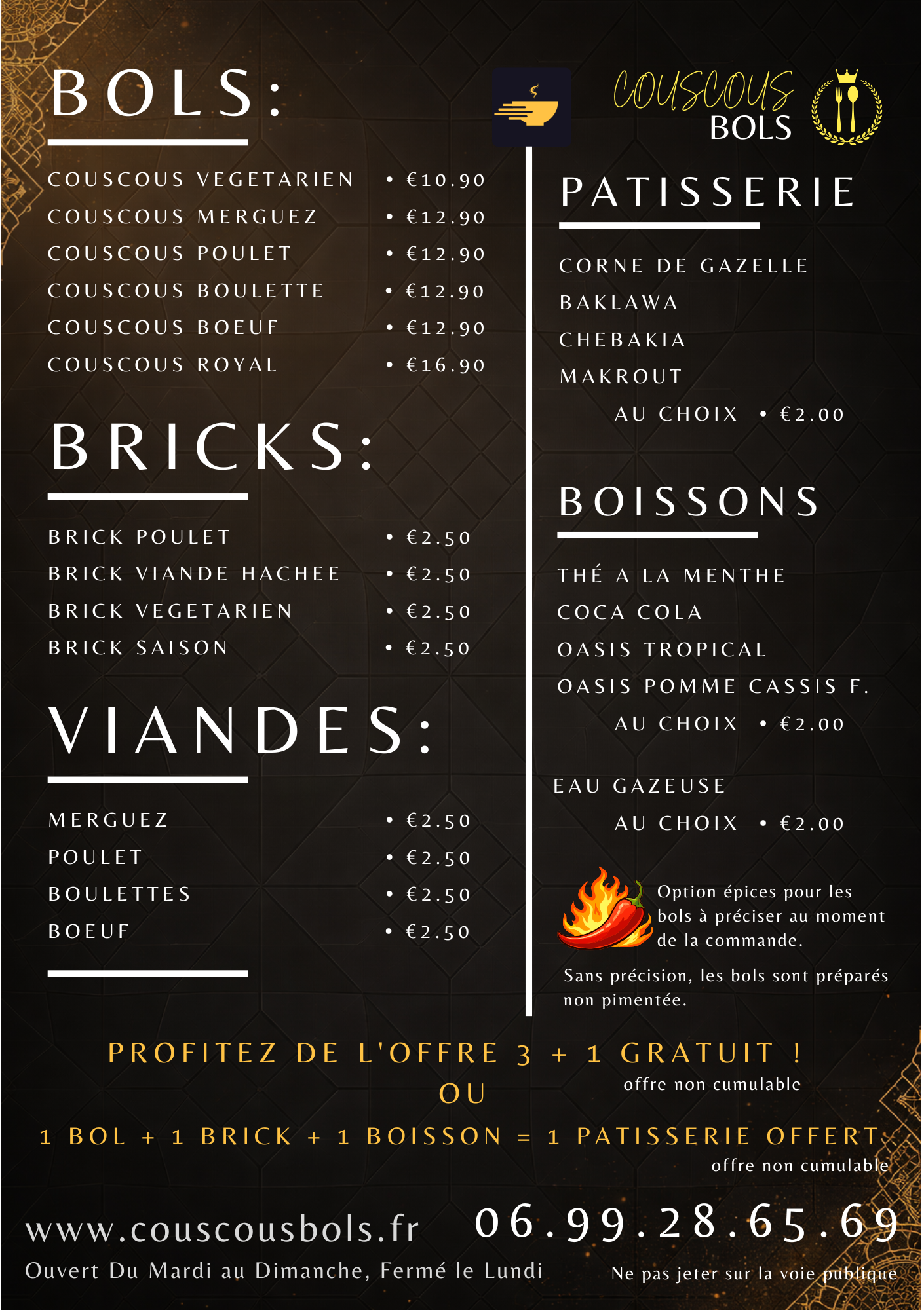 Offre Duo Bricks 2 bricks viande hachée et 2 bricks poulet, dorées et croustillantes, accompagnées de leurs sauces. L’idéal pour se faire plaisir à plusieurs ou pour les grosses faims.
