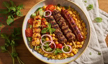Boulette de bœuf, morceaux de poulet, morceaux de bœuf et une merguez grillée, accompagnés de légumes mijotés et d’un bouillon parfumé. Copieux, complet et vraiment réconfortant.